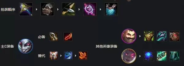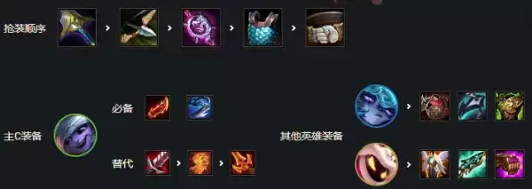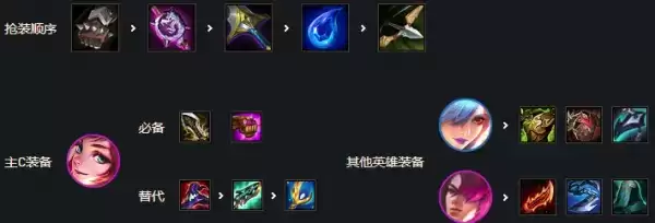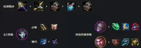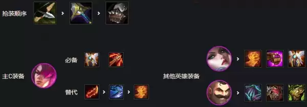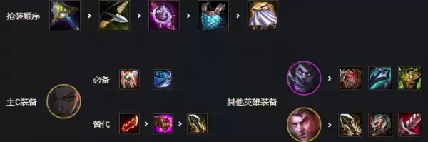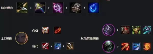 优先剑姬三神复活法爆无尽,或者巨杀法爆正义,加里奥肉装狂徒反甲龙牙或者板甲,给猫鬼书便可。其他输出装备给副C发条也有不错的效果伤害很高。