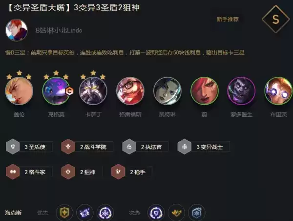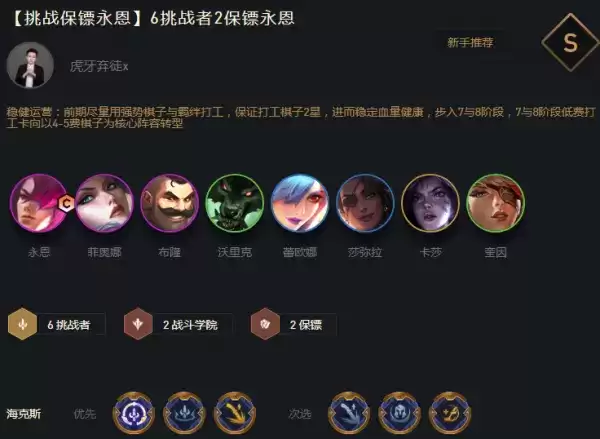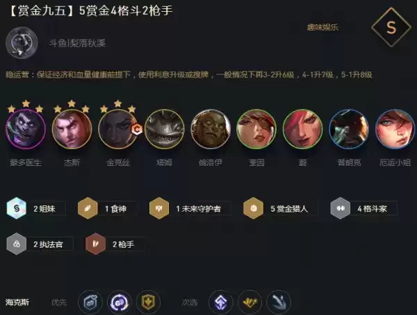 盖伦穿肉装顶在前排承伤,大嘴女警分站两侧,其他牌和大嘴抱团防刺客