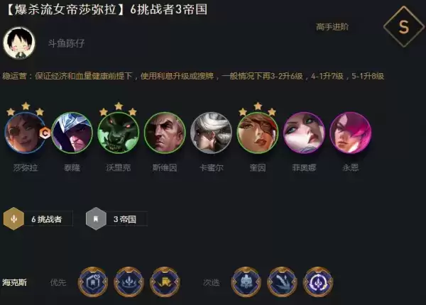 前期连败开局的话3-2可以小D提一下质量,可以先给船长打工,最好能上7D。凑出3帝国4挑战阵容,D到二星莎弥拉,6个二星可以稍微停手,然后看外面质量决定是否可以上八追三。