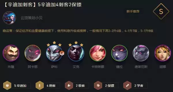 7人口开D,搜出2星小丑后,再上8找阿卡丽。然后追三星小丑,三星艾克,2星阿卡丽。正常先组出5辛迪加和4刺客,然后8人口补风女,凑出2极客,2学者。优先辛迪加转,7辛迪加收益大于6刺客。如有刺转可以下卡特,上发条,或萨勒芬妮,凑2白法师或名流,看质量和名流位置。一般4刺客够用,不一定追求6刺客,看棋子质量优先。