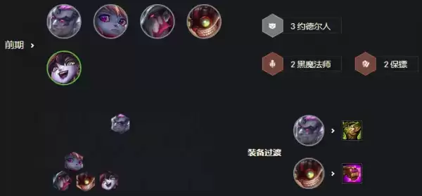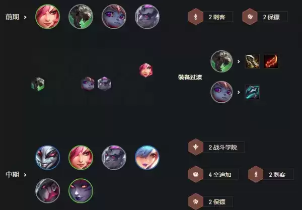 成型好打大多脆皮阵容,难打带闪避的约德尔人,很肉的炼金格斗家。追三星小丑,2星阿卡丽是质量上限,就都有一战之力。刺客环境还不错,能用的贴心海克斯羁绊很多。优先:额外辛迪加,烟雾弹,短兵之利,额外刺客。1-3最好拿马上有战斗力的羁绊,方便稳血过度。如:日炎棋盘,浪人都能用。小丑装备不难凑,最好不卖血。