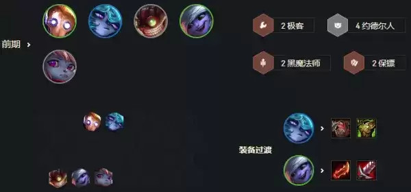 3/2拉6六不D。当然如果不是连胜的情况下可继续攒钱,五十块钱吃利息就可以,慢慢拉人口不过4/1必拉七口做提升,因为大部分玩家这个时候都会做提升,或者有同行的话会被抢卡,不提升就被血入,D出体系卡,装备给厄加特直接锁血,金克丝不容易找而且难升二星所以先不急着给她留装备,七口开出四斗双枪锁血攒钱拉八口找金克斯和二星蒙多二星厄加特,当然锁不住血就不拉八,七口找出二星厄加特来锁血。看情况8口可上风女保护也可以单挂猫咪,看情况而定能拉九口可以挂个白魔或者单挂五费猫咪,我们还是比较缺控制的。