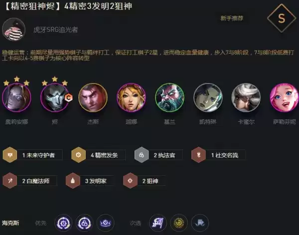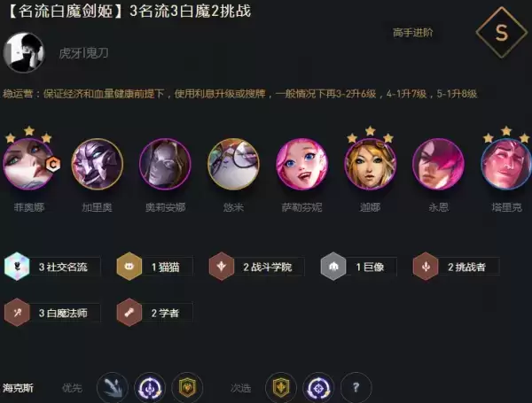 阵容灵活多变,有精密转职可以将青钢影换成宝石开2社交名流2白魔法师。质量高能有效对抗所有阵容,想吃鸡2星杰斯或者3星烬非常关键,烬在4费卡里算是比较好追三星的棋子。