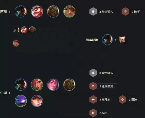 3阶段在5级慢D女警、盖伦、男枪、卡萨丁、大嘴这5张卡三星;有2-3张一费卡三星后拉6,4阶段在6级慢D大嘴和剩余卡三星;最晚5-1三星大嘴后,找机会拉8级完成最终阵容