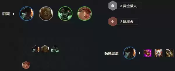 青钢影+狼人+莎弥拉+奎因+波比+蕾欧娜。中期3阶段一般不D牌,划水过渡,靠嫖卡补充4挑战者,前排则依旧是2保镖过渡。当然如果前期走的是卖血路线,那么3-2拉到6人口后可以小D10-20块,补充场上质量。