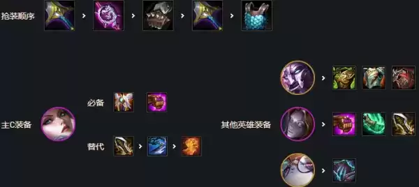 如果偏AP,就给黑默丁格,黑默丁格主要需要蓝buff和法爆,如果偏AD,就养小炮,羊刀巨杀必备,剩下一个补回血装备,最好是饮血,其次是正义之拳。最后小法出来以后,通过5阶段选秀和5阶段的巨龙给小法拿装备。