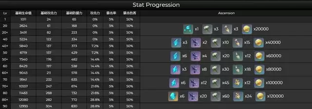 首先是基础属性与突破材料,基础属性方面每次突破会提升攻击力,可以看出是个需要攻击力的输出职业了。然后突破材料方面除了一个新材料不认识以外(有可能是岩层新boss),清心和骗骗花蜜可以开始储备了。
