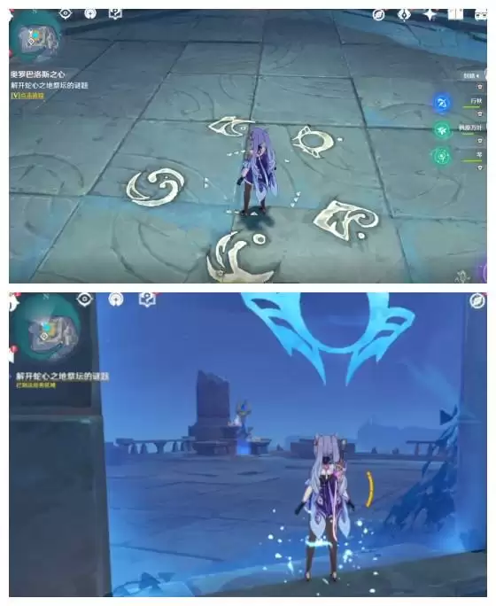 Ⅱ.启动蛇心之地的祭坛密文,解开蛇心之地祭坛的谜题:将传送点附近的日月**调整至『常夜』状态,观察建筑物中间地上画着的键纹图案和对应的数字顺序,依次触碰建筑物周围印有键纹图案的屏障,随后就会出现一个精致的宝箱,打开后即可获得『苏生之辔』碎片*1