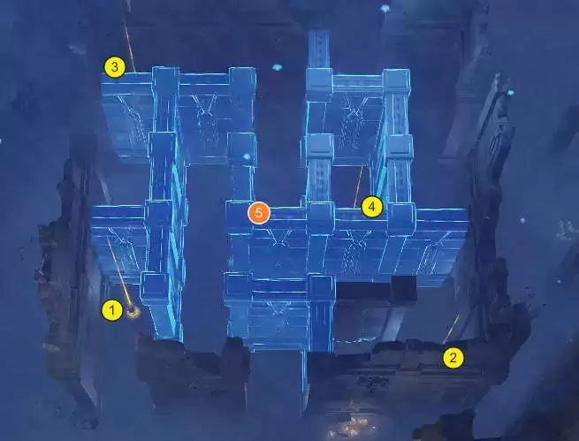 (3)在“常夜”,我们从左下角进入迷宫。触发1~4号位的水元素方碑,即可打开5号位置的天窗,通过迷宫。