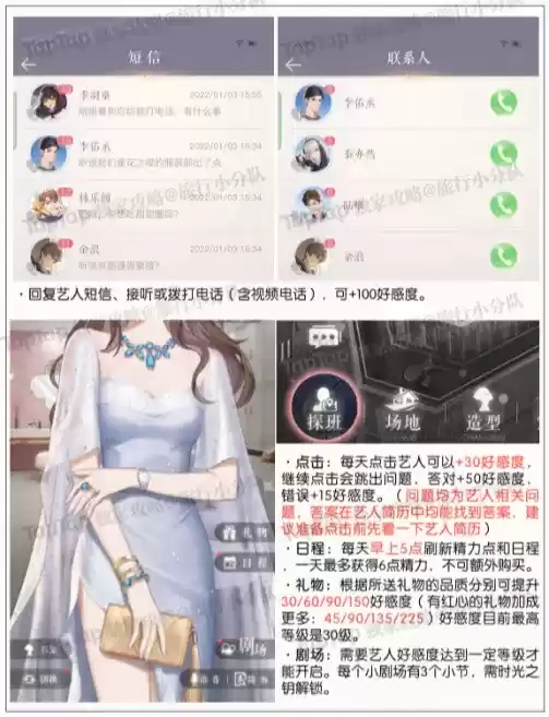 在通过主线第二章节后,我们解锁艺人好感度功能,在主界面左下角“探班”里。以及目前已经出场了的艺人“初夏”,第三章解锁第二位艺人“余浪”,余下艺人会根据主线的逐渐推进而解锁,如果还不确定哪位艺人是你的菜,可以先看看对艺人的概括,接着多多通关主线解锁和他们的剧情,确定哪位是自己想培养的大明星吧: