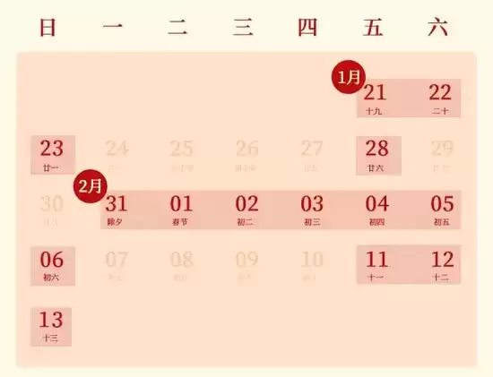 1月31日—2月6日(春节假期)2月11日—13日(周五、六、日)