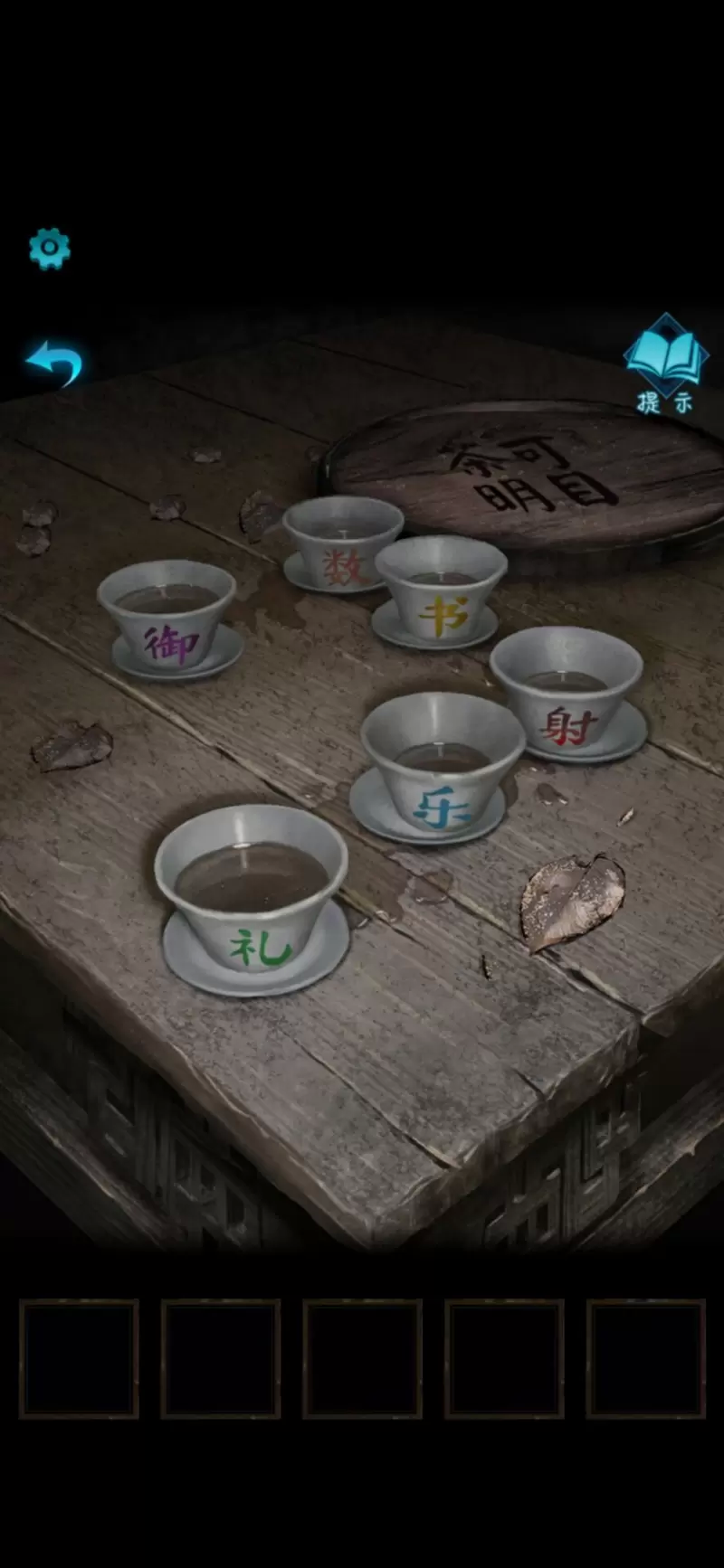 茶杯上会显示出来字样,这个是箱子的六艺的密码,按照颜色和字对应的位置摆好,这个比较简单。