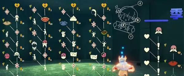 1、潜海季先祖兑换图鉴如图所示,兑换完所有物品需要350根蜡烛,所以玩家需要尽量多收集一些蜡烛以便在新季节中兑换。