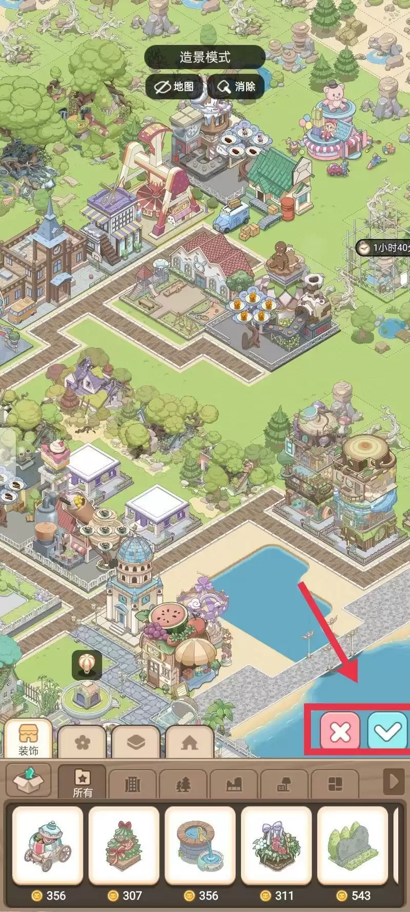 3.“一键收纳”工具顾名思义就是将放置出来的建筑全部(仅限于屏幕内)收起来(只收一个类型的,比如:图中是“装饰”—“所有”,所以所有放置在外面的装饰就会被收起来)