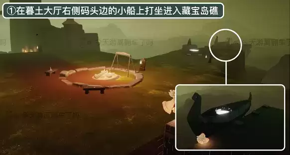 1、在墓土大厅右侧码头边的小船上打坐进入藏宝岛礁。