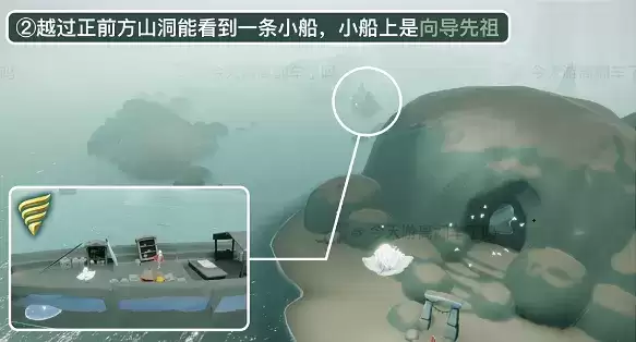 2、越过正前方山洞能看到一条小船,小船上是向导先祖。