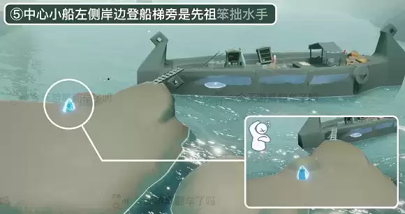 5、中心小船左侧岸边登船梯旁是先祖笨拙水手。