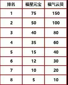【集福模式】单场排名可获得“福星元宝”和“福气云贝”数量如下: