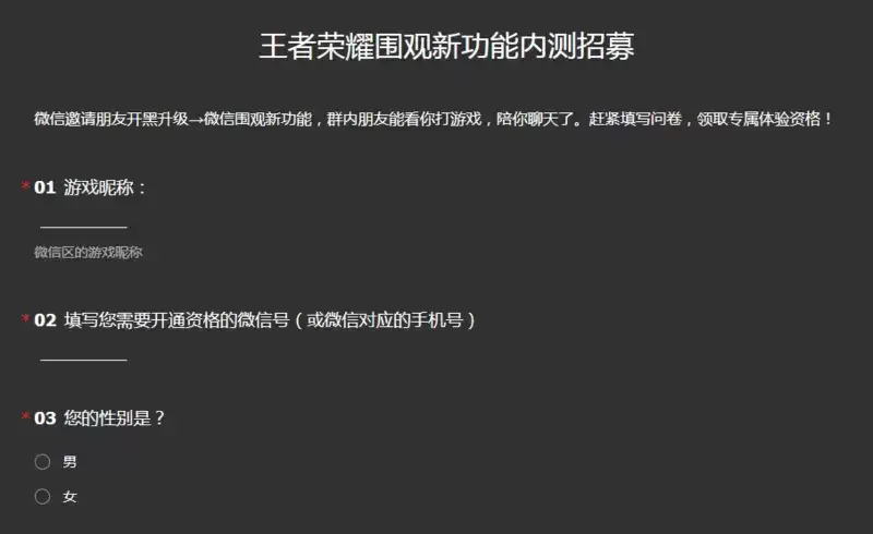 王者荣耀围观功能怎么开启?怎么王者荣耀正式团队将重新开启微信围观功能,在朋友群里就可以看你在游戏里的打法,还能陪你更好的聊天,不过目前该功能目前还在内测招募中,大家可以填写问卷调查将会有机会获得资格。