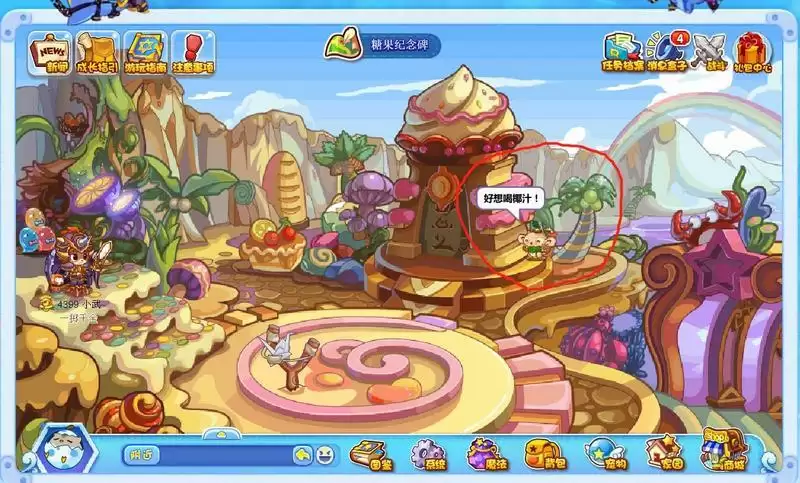 玩家进入糖果迷城地图中的糖果纪念碑,通过点击椰树上的猴子可以得到光灵石;