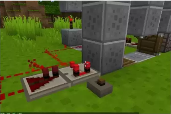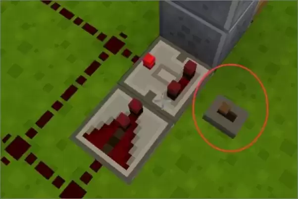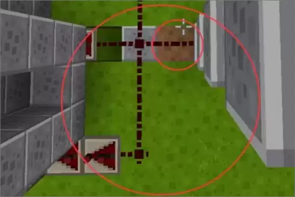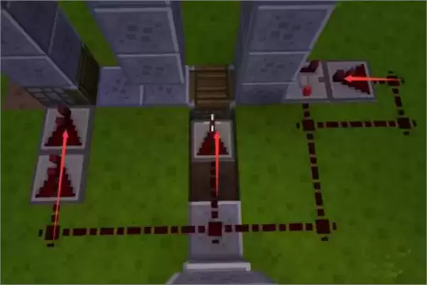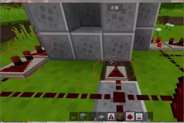 4、红石的放置,注意箭头的朝向,中间的朝下挖了1格。