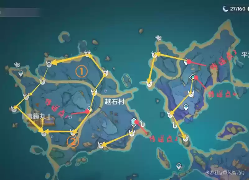 传送点1的路线①大致轮廓为沿着北海岸线转半圈,最终落脚点是在“清籁丸”这艘废弃的船上,因为清籁丸内有许多调查点,包括圣遗物狗粮矿武器和蔬菜水果,所以鲨完这一条线最后可以去摸一下。至于往下走的路线②,那个山头上有一只水镜,单人锄地如果想完整的锄完可以先用团扇飞下来然后去清籁丸前,再传回去从上边走鲨到清籁丸前雷丘丘王的那个点。另外如果是多人锄地,因为从丘丘王的点到清籁丸是用雷种子飞过来,不能多人使用,所以也可以考虑先下后上,不会漏怪也免去一段路程。