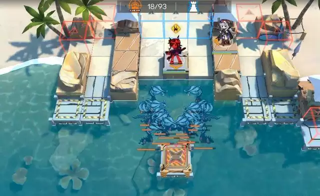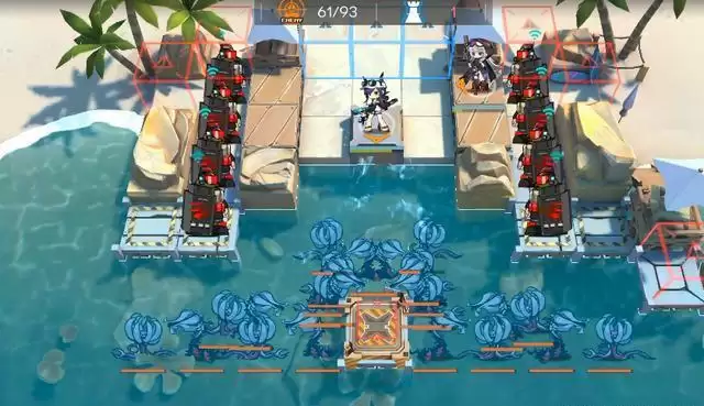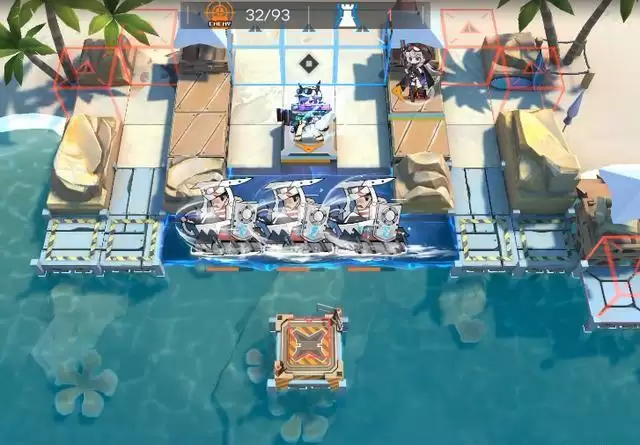 敌人聚集汇聚的时候照常输出不用管,当大盾哥开始准备上岸后,果断开启技能清理掉。