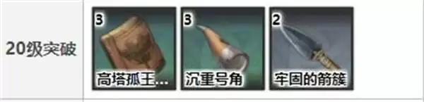 20级:高塔孤王的破瓦*3、沉重号角*3、牢固的箭簇*2、摩拉*0.5万