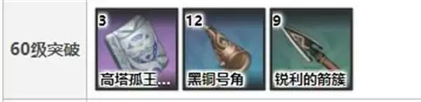 60级:高塔孤王的断片*3、黑铜号角*12、锐利的箭簇*9、摩拉*3万