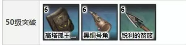 50级:高塔孤王的残垣*6、黑铜号角*6、锐利的箭簇*6、摩拉*2万