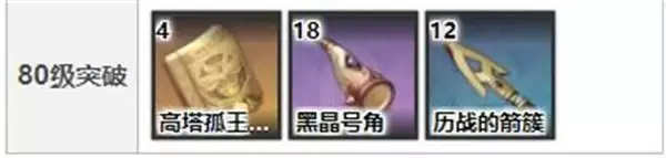 80级:高塔孤王的碎梦*4、黑晶号角*18、历战的箭簇*12、摩拉*4.5万