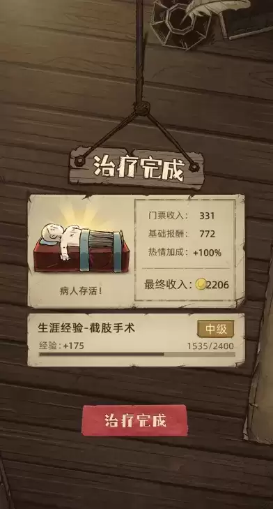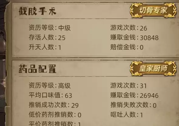 前期可以放血赚一点钱,第一轮用水蛭放血就能拿一千多一次,但后来如果没观众赚的就很少了。刀升级攻击力高点的,我升的是分离式刀,这样两刀结束病人状态减的少一点。下面升级绑带和金烛台不然后期不好过。当然我是不想患者升天,无所谓的刀可以升级银刀(老师死后得到),下面的看需求升。