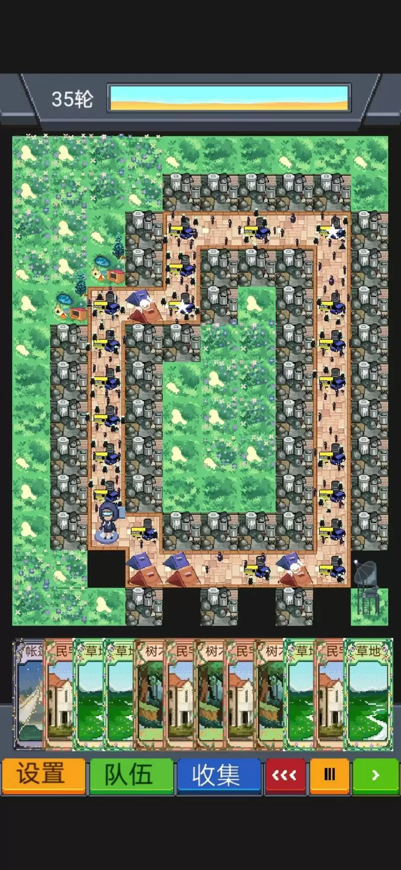 已有大神在论坛上发过了,居然刷到520轮!(我粗略算了下,至少要挂3小时啊!请收下我的膝盖!)我谈谈经验,除了草和警局,其他东西千万别放!警局流刷怪少,所以卡牌获得就少,可以像我这样在左下角合成一个大草原,阵型成型后拆。楼主脸比较黑,刷到30轮才刷到拆。