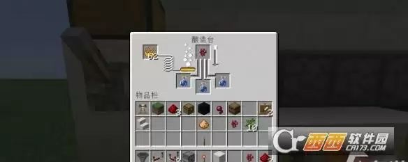 在炼药台的上方和左侧放上漏斗,上方作为酿造材料输入口,左侧作为水瓶输入口。