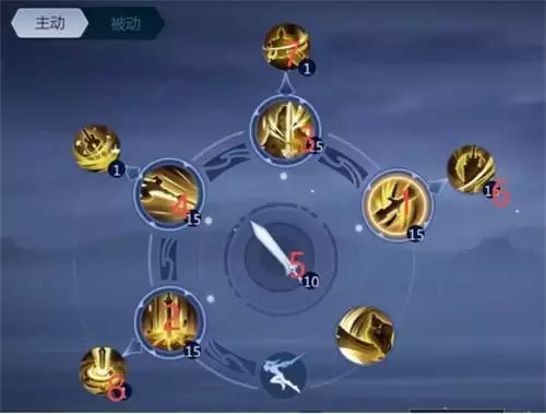 如上图所示,主动技能优先加,按照图中序号1234的顺序,把一个技能点满后,再开始点下一个技能。