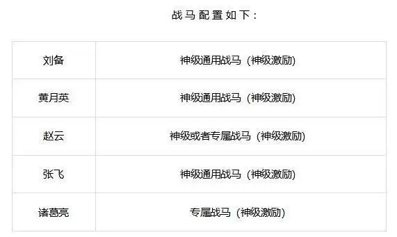 这个配置,诸葛亮进场士气65点(5个神级激励25点,专属战马40点),四将进场士气25点。其中黄月英可以替换为蜀国任意鼓将,赵云可以替换成其他蜀国输出(全体输出最好,由于目前蜀国全体输出武将未全部开放,暂时用赵云替代)。