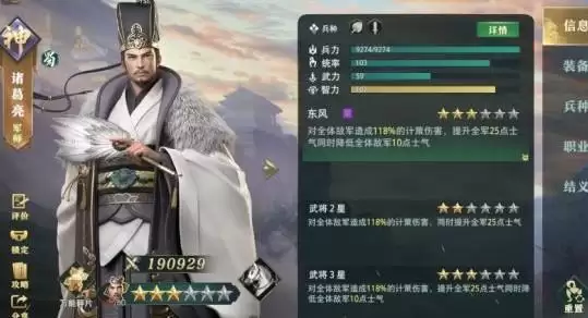 首先诸葛亮要三星最好是有扇子,诸葛亮的星级还是很重要二星与三星的差距还是很大的三星之后释放技能能减一下敌方全体武将的士气