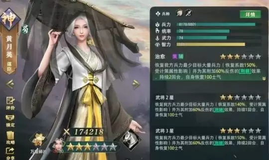 黄月英他的基础属性一般自己是一个单体奶妈奶量很足缺点也是就能奶一个,这个基本几星差距不打也只增加一些奶量与反伤比,特点就是放过一次技能后给自己回复一定的士气下个回合还能继续放技能奶队友