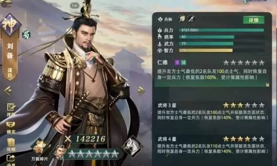 刘备同样作为三皇他的作用也非同小可他的技能是给两个士气最低的人回复100士气同时在回复自己的兵力,