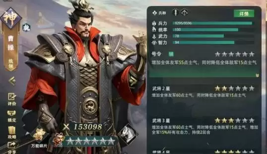 曹操曹操作为三皇在卡池里的地位还是高的基本什么都能搭配的,他一星就能减敌方的士气并且给队友回复55的士气,三星都略有增长同时还增加了一个属性给友军加百分之15的攻击力持续两回合