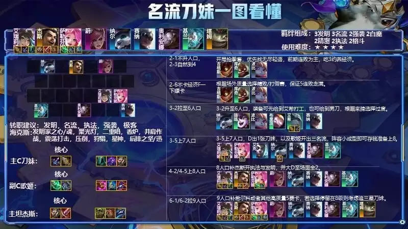 正常情况4-5左右就可升八,找出萨勒芬妮优先开3名流羁绊再去补其他羁绊,把阵容完整搜到二星之后就可攒钱考虑上九,5-1前刀妹必须二星,二星刀妹神装强度必定锁血。看局势决定上九人口补五费两星还是选择在八人口直接死追三星刀妹。