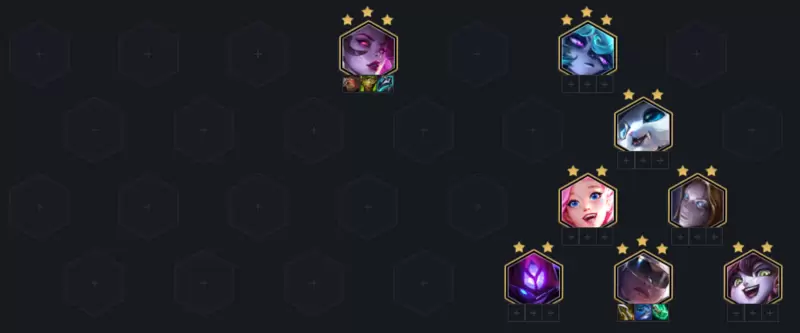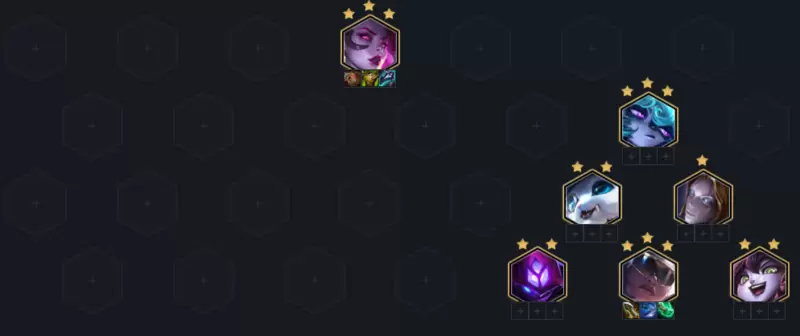 棋子组成:莫甘娜(3)、薇古丝(3)、纳尔(3)、萨勒芬妮(4)、奥莉安娜(4)、玛尔扎哈(3)、赛娜(3)、璐璐(2)
