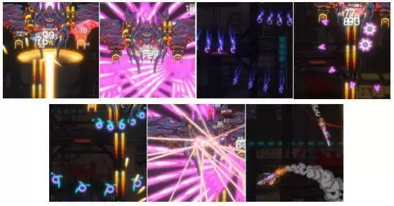 boss蝠诡,受击部位分主炮,左右肩炮,左右翼炮。主炮,发射激光束;左右肩炮,发射蓝色雷球弹(扇形向下缓慢投射),粉色扩散弹(核心缓慢下落后碎片向外分散);左右翼炮,发射粉色喷射弹(接近全屏攻击,仅剩一片扇形空隙),紫色散射弹(蝌蚪形状,扇形向下投射),此外,不受击的主体还会发射粉色激光及追踪火箭弹。