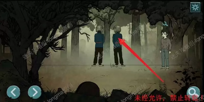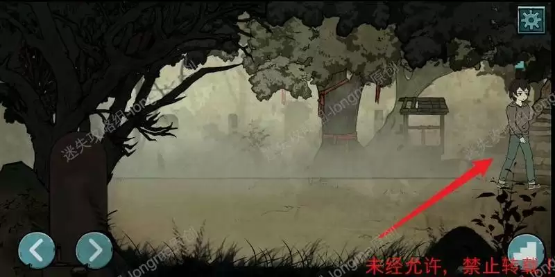 向右进入洞中完成小游戏(根据地图显示,画圈的地方有女鬼,进入女鬼地盘,然后快速的返回,可以将女鬼引到其他地方,注意:看到女鬼返回后需要快速的进入到下一个安全地带,女鬼会快速到来,安全后需时刻观察地图,找到正确路线),出去后第五章结束。