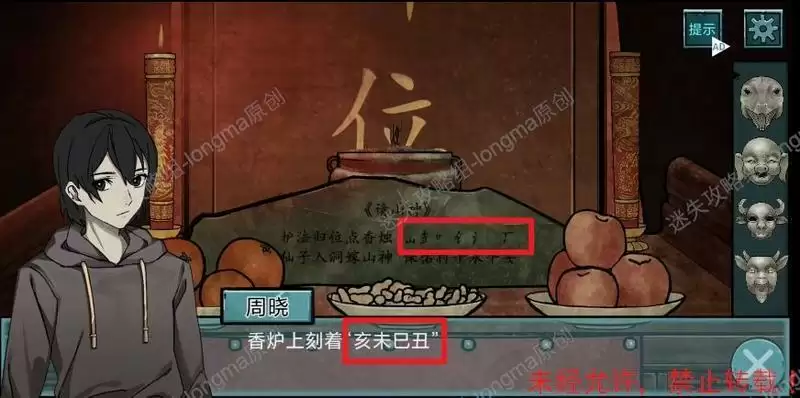 进入祠堂,观察中间神案,点击香炉得到线索“亥未巳丑”和下面诗词第二句的偏旁。