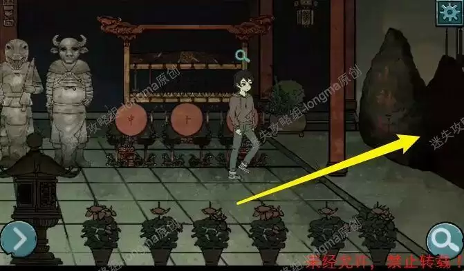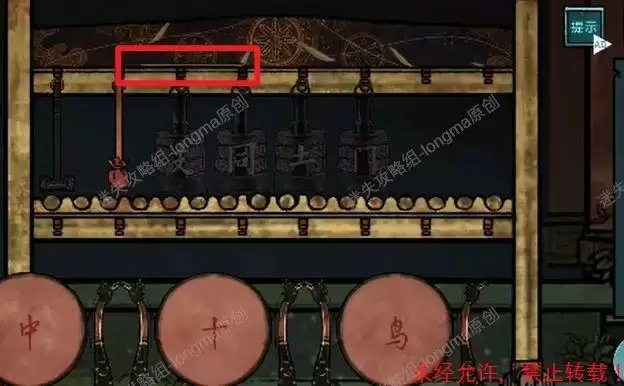 观察右边的编钟,对照神台下的第二句诗的偏旁,补全这些字,依次点击“击鼓鸣钟洞门开”,打开右边的门。
