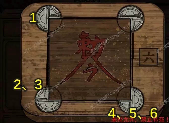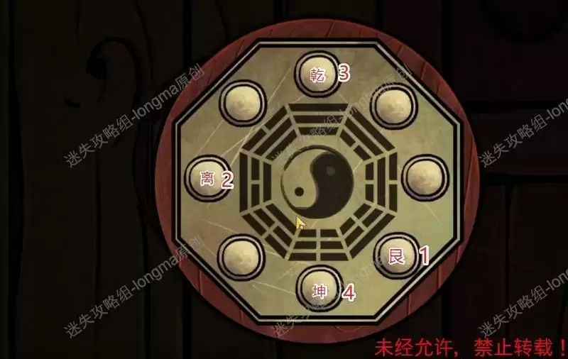 回到一楼,观察神像上方的八卦镜,记住:艮、离、乾、坤对应的位置和顺序,返回二楼,观察最右边的八卦,按照顺序点击对应的位置。