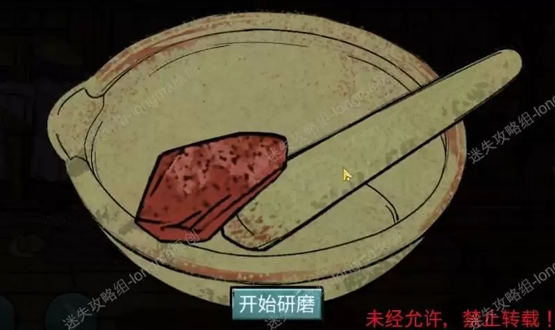 在右边的凳子下找到研钵,完成小游戏(游戏非常简单,按压朱砂块,直到全部成粉),将【朱砂块】研磨成粉。