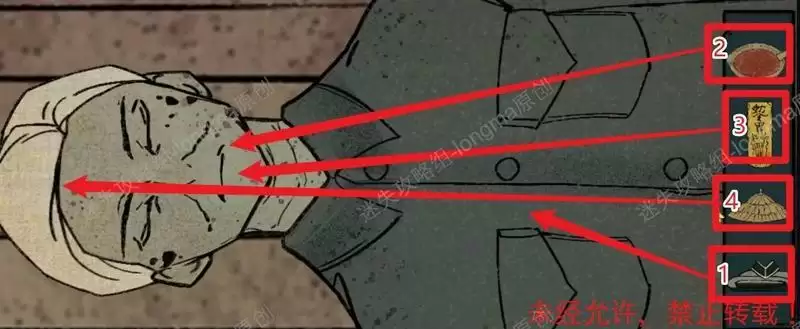 返回一楼,和赶尸人对话,然后依次给尸体穿上【素衣】,打开嘴巴放入【朱砂】(穿上素衣后才能打开嘴巴,需要先点击下嘴巴),使用【符咒】堵住嘴巴,使用【斗笠】盖住脸。