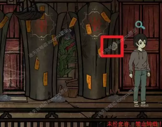 向左来到神像处,观察神像,点击下面的盒子完成小游戏(六步使机关缺口对着中间,步骤:1左上,2左下,3左下,4右下,5右下,6右下)打开盒子,得到【符咒】。
